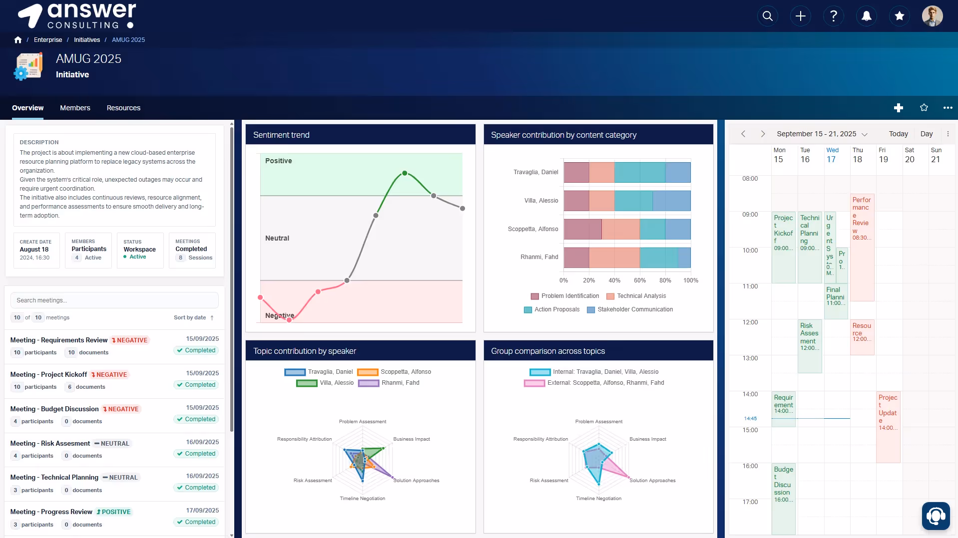 Thanks to an integrated RAG-based assistant, users can go even deeper — asking contextual questions related to documents, transcripts, or the broader initiative without having to read through the entire meeting content.