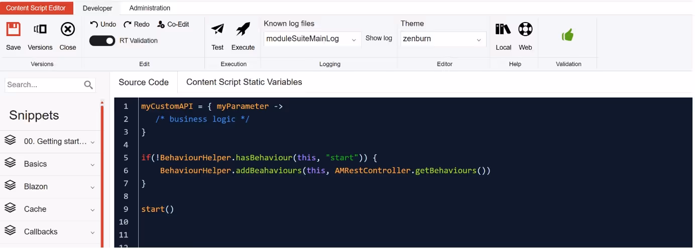 Creating a new API with the Module Suite is remarkably straightforward. Regardless of how complex the business logic might be, the process itself is simple: developers just need to create a Content Script, place it in the designated volume (ContentScriptVolume→ CSServices), write as little as four lines of code and add the required business logic.